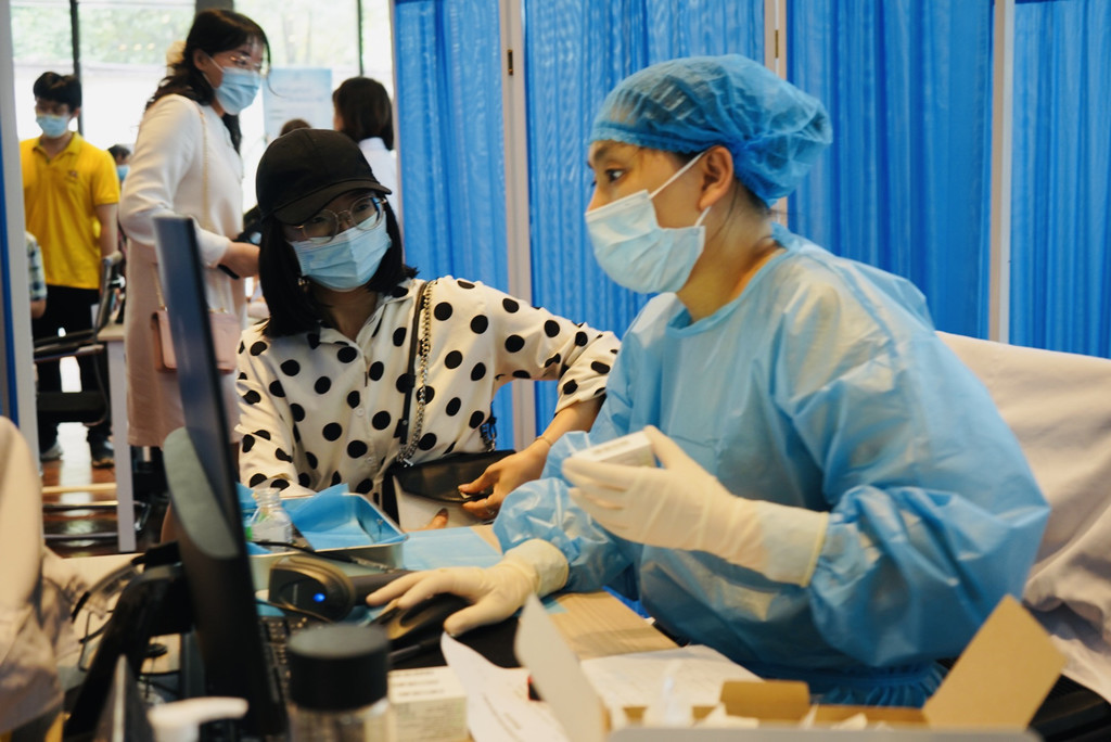 锦江区沙河街道新冠疫苗临时接种点,医护人员冯倩正在为居民接种。魏冯摄。 由于记者去时,正值午休,不少工作人员趁着中午,伏桌休息。四川锦欣妇女儿童医院护士罗久萍的隔离服已是大汗淋漓,下午她打算换过另一身隔离服再去接种。“每天我7点从家出发、8点到岗,下午6点后下班,忙完回家就是8、9点了,每天不敢喝太多水,怕接种中途上厕所。”坐在罗久萍后方的另一名医护人员冯倩,则拿了自家娃娃的吸汗巾放在肩颈部吸汗。