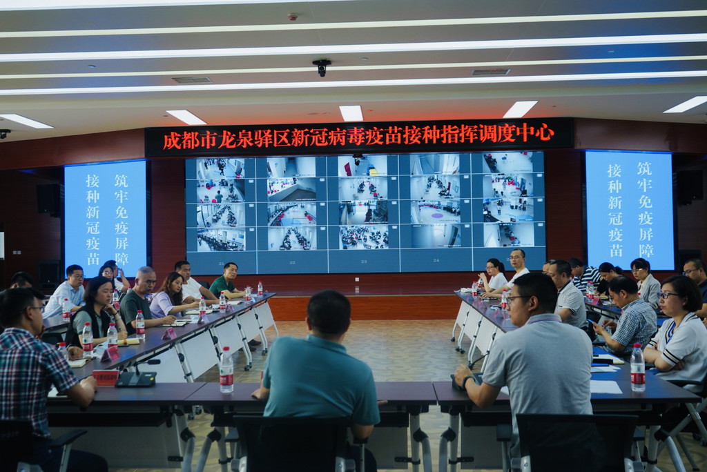 龙泉驿新冠病毒疫苗接种指挥调度中心正在开会,大屏幕上的是新建的新冠疫苗接种指挥调度平台。魏冯摄。 “我们是全市第一个成立新冠疫苗接种指挥中心的区县,你看,这个大屏幕上的就是我们建的新冠疫苗接种指挥调度平台。”龙泉驿区卫健局疾控科工作人员李弢介绍,调动中心通过利用监控系统实现对接种点位视频远程监管、实时响应、高效调度。
