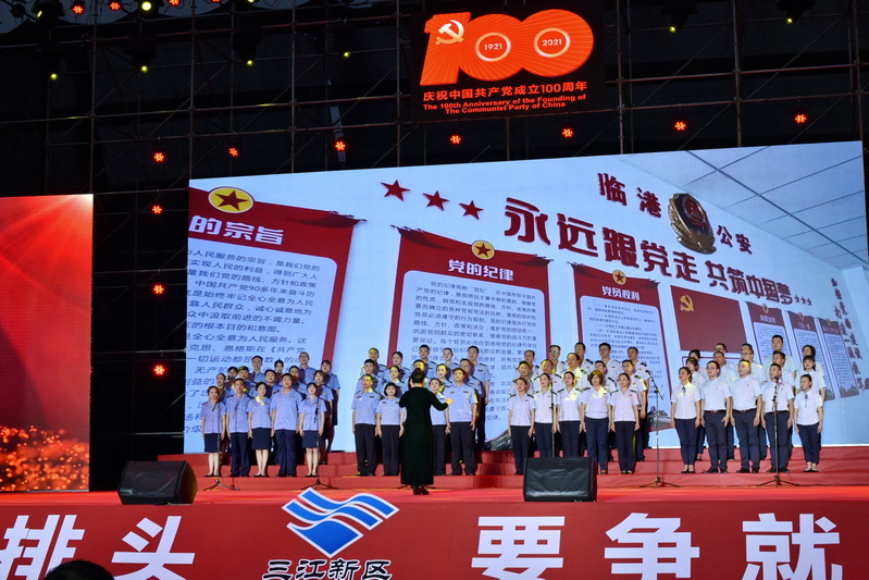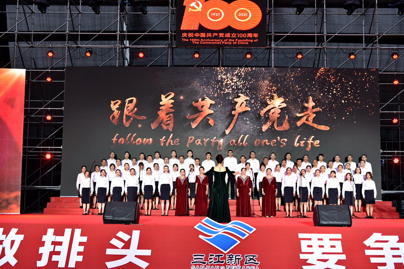 机关党委一队率先出场,陶学周、兰宏彬等区领导带领区办公室、区纪检监察工委、区党群工作部、区发展政研局队员引吭高歌。“你是灯塔,照耀着黎明前的海洋;你是舵手,掌握着航行的方向。”,熟悉的经典旋律缓缓响起,一曲《跟着共产党走》唱出了三江新区全体干部职工的心声,中国共产党引领几代人一步步实现中华民族伟大复兴梦的奋斗场景历历在目,台下数百名观众舞动国旗,纷纷跟随旋律一起歌唱。
