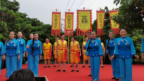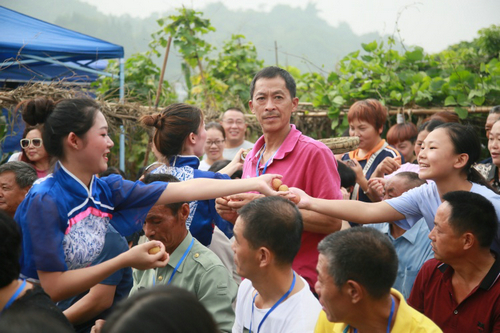 从盛唐穿越至今,在唐小妹的引导下,游客们来到山歌悠扬环节,小伙子和姑娘在荔枝树下唱起高亢嘹亮的合江山歌,一人歌来众人和,在歌声中把荔枝送到游客手中。