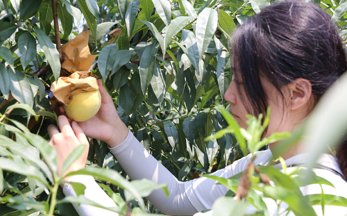 七月的凤龙村铭创园内,淡淡的果香四溢。据负责人介绍,这里的黄桃分为七月初上市的“锦花”,和七月中上市的“锦绣”两个品种,成果重达六七两,皮薄肉厚,果实白嫩,咬上一口,酸甜口感恰到好。看满山黄桃黄,赏自然乡村景。放眼望去,一颗颗黄桃挂满枝头,又大又甜的黄桃绚丽了整个山野。