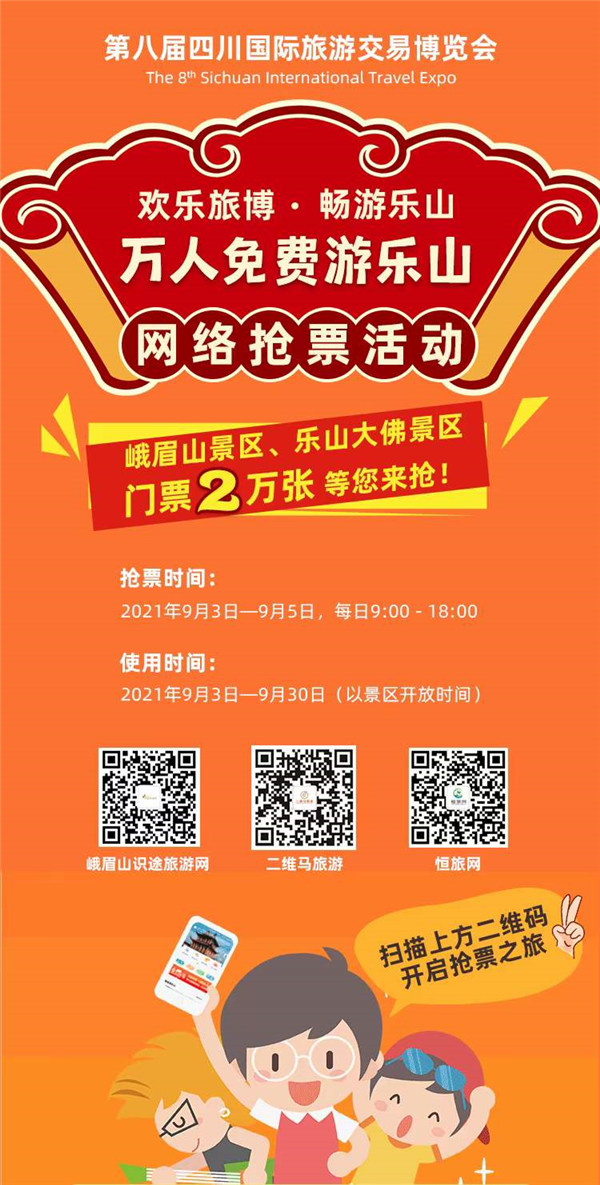 四川新闻网消息(李薪)9月2日至9月5日,第八届四川国际旅游交易博览会将在乐山市峨眉山市举行。旅博会期间,乐山市将推出“欢乐旅博·畅游乐山”万人免费游乐山网络抢票活动,乐山的佛国仙山、美食美景势必将再次迎来客流高峰。
