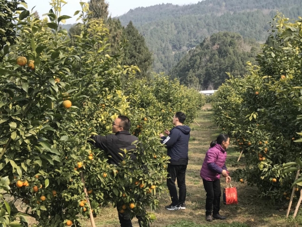 2月16日,在梓潼县仁和镇檬垭村6社,果农张雪华正在开始采摘沃柑。绿油油的叶子、橘红色的沃柑、红彤彤的衣服相互映衬,格外显眼。在果园里,一些游客开始现场体验采摘的乐趣,外地客商准备签订采购合同。