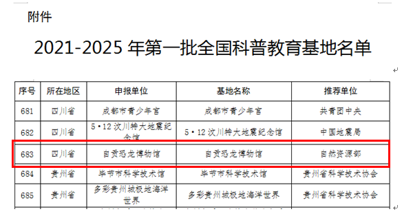 四川新闻网消息 4月2日,中国科学技术协会官网发布《关于命名2021-2025年第一批全国科普教育基地的决定》,经过初评、终评和公示等程序,全国800家单位被认定为2021-2025年度第一批全国科普教育基地(含博物馆、纪念馆166家)。四川有8家博物馆上榜,其中,自贡恐龙博物馆在列。