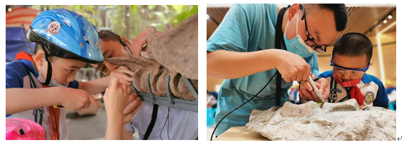 博物馆先后策划了一系列恐龙主题特色教育活动,如恐龙装架、化石修复、恐龙泥塑DIY、恐龙穿新衣、恐龙奇妙夜、恐龙科普剧场、恐龙科普人偶剧……从课堂教学到动手实践,从野外科考到情景演出,从线下的面对面讲授到线上的无接触教学,形成了多维度、多形式、多场景的恐龙主题教育活动体系。