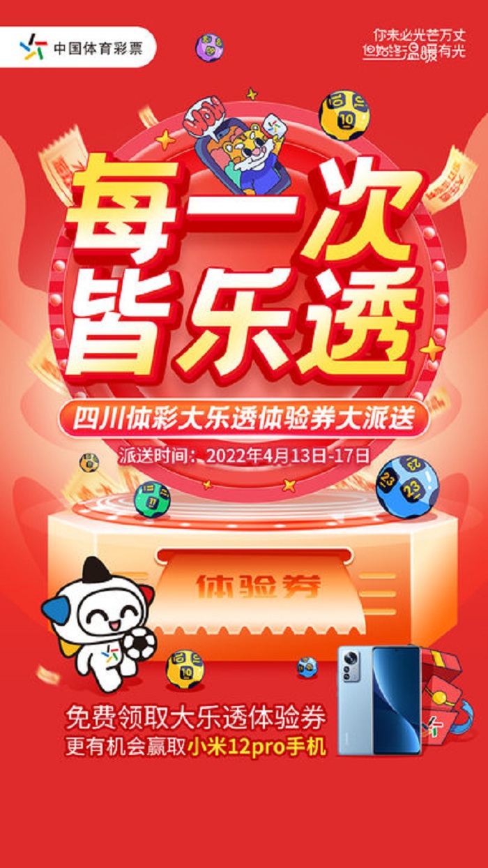 四川体彩为回馈购彩者长期以来对超级大乐透游戏的支持和热爱,在4月13日至4月17日期间,通过线上推广并向四川省用户发放大乐透游戏体验券,用户在四川省体彩网点购买大乐透且单张票面金额大于体验券金额时可使用体验券;使用体验券后还可参与二次抽奖,有机会获得小米12Pro手机。(详情资讯“四川体彩网”官方活动公告)。