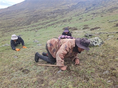 贡呷洛珠穿着棉袄,腿上绑着橡胶护膝,双膝跪在草地上,俯身搜寻。与他结伴的是村里的恩珠夫妻俩,他们也趴着身子,不放过眼前的每一寸草地。