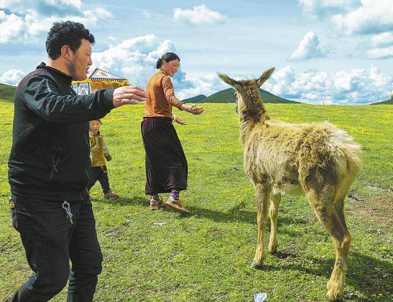 2022年7月14日,在海拔4450米的甘孜州白玉县安孜乡门马一村高原牧场,一只国家二级保护动物白唇鹿跟随牧民达瓦拉姆家的牦牛群,悠闲地在草场上觅食青草。吃饱喝足后的小鹿回到牧民定居点的达瓦拉姆家门口,还会主动把头伸到达瓦拉姆的怀里蹭来蹭去,呦呦地叫着卖萌。