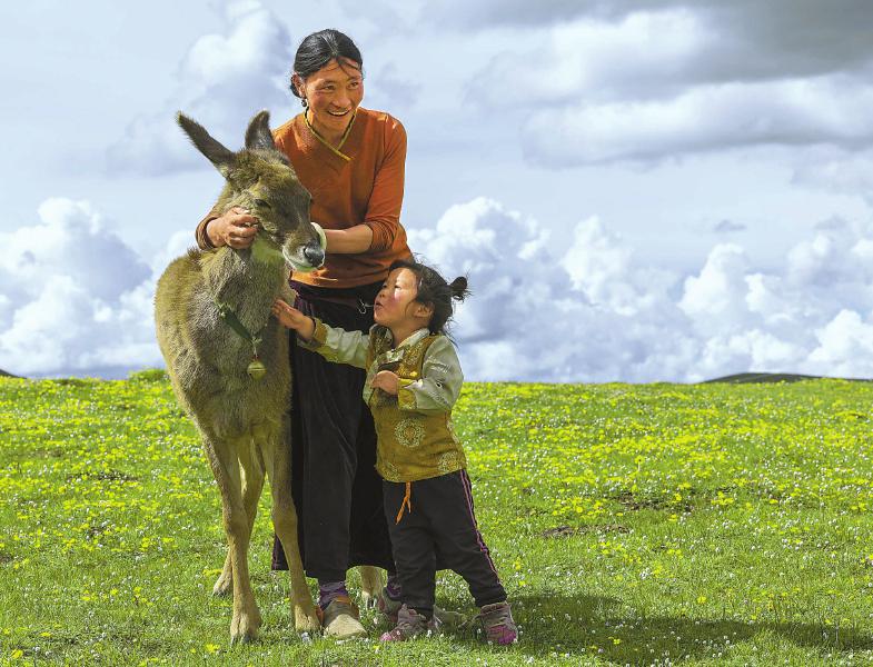 达瓦拉姆带着三岁的孩子白马仁真和小鹿一起散步
