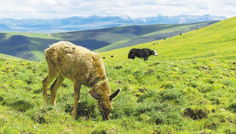 小白唇鹿每天都会跟着达瓦拉姆家的牦牛群在高原牧场吃草玩耍