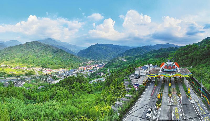8月21日,俯瞰熊猫形象的雅西高速龙苍沟收费站。由此一路盘旋到山下,就到了万年村。记者 杨树 摄