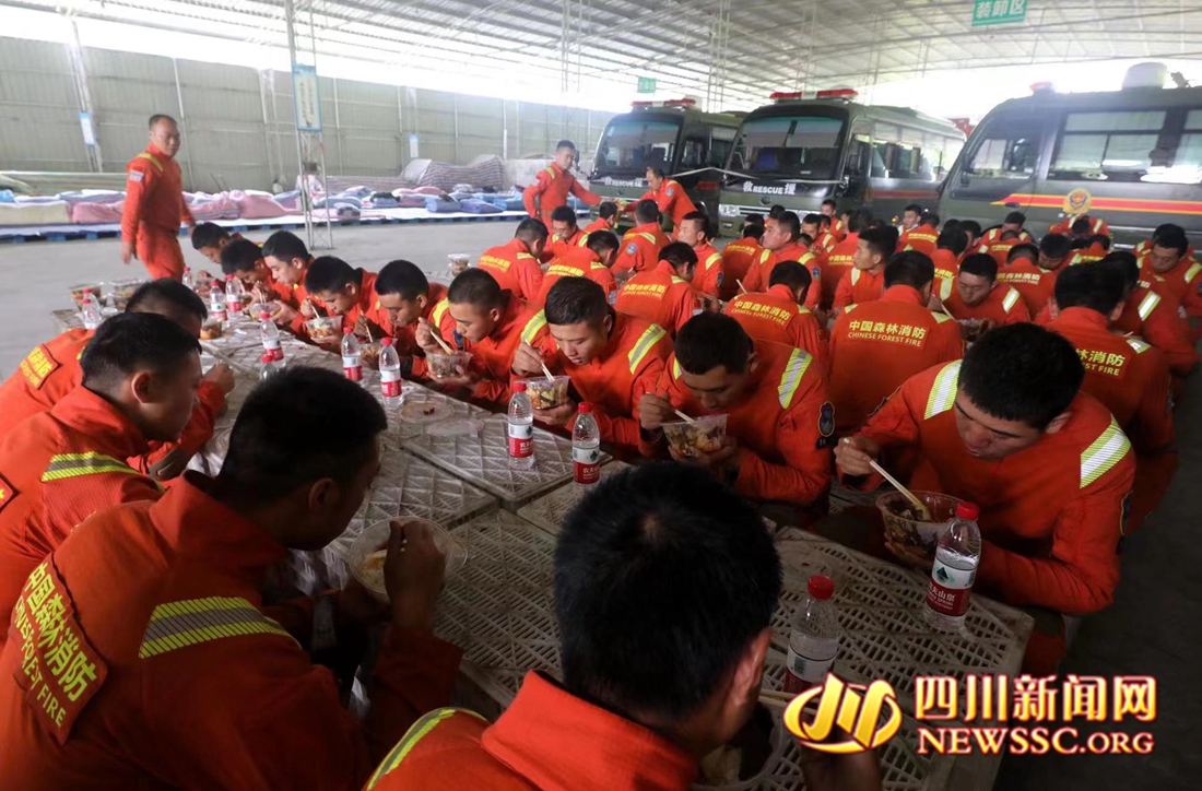 川网传媒·四川新闻网雅安9月10日讯(川网传媒特别报道组记者 杨德慧 李举涛 摄影报道)9月9日中午,石棉县新民乡人民政府不远处的一处厂房内,四川省森林消防总队特勤大队消防员在此短暂休整。午餐时,他们以水果筐为餐桌,搭起一个临时就餐区,大家终于坐在一起安心地吃了顿饭。