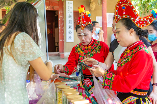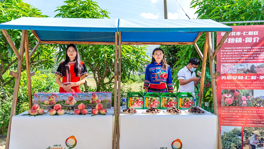 吆喝声不绝于耳,琳琅满目的商品让人挑花了眼,在一个个简约小巧的摊位上,芒果、石榴、火龙果、雪桃、香米......来自仁和区各乡镇的精品农特产在这里集中展销,引得人迈不开步子,每经过一个摊位,便要好好品尝一番。