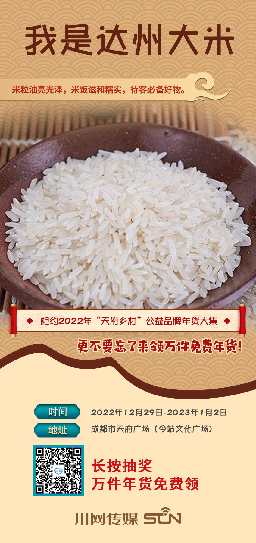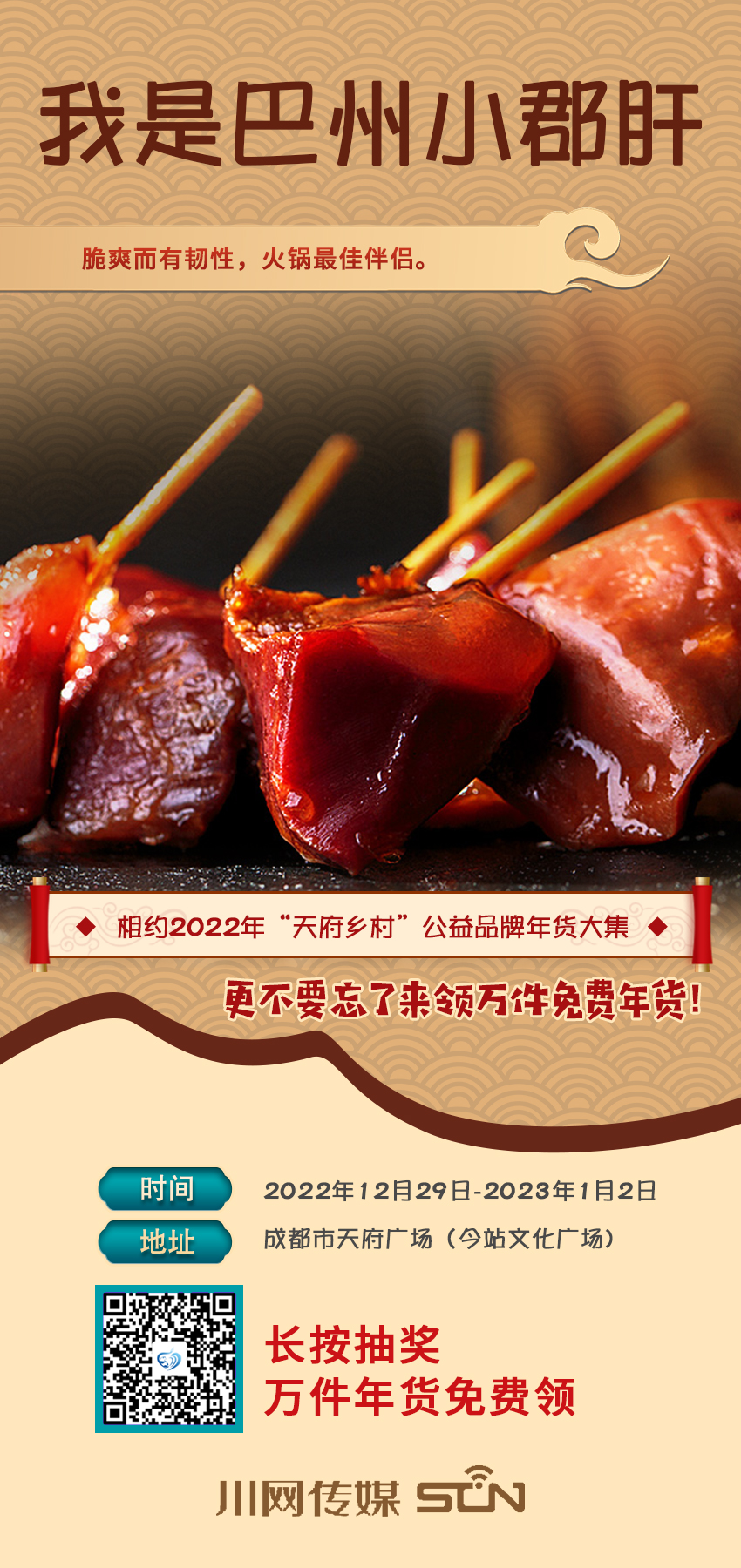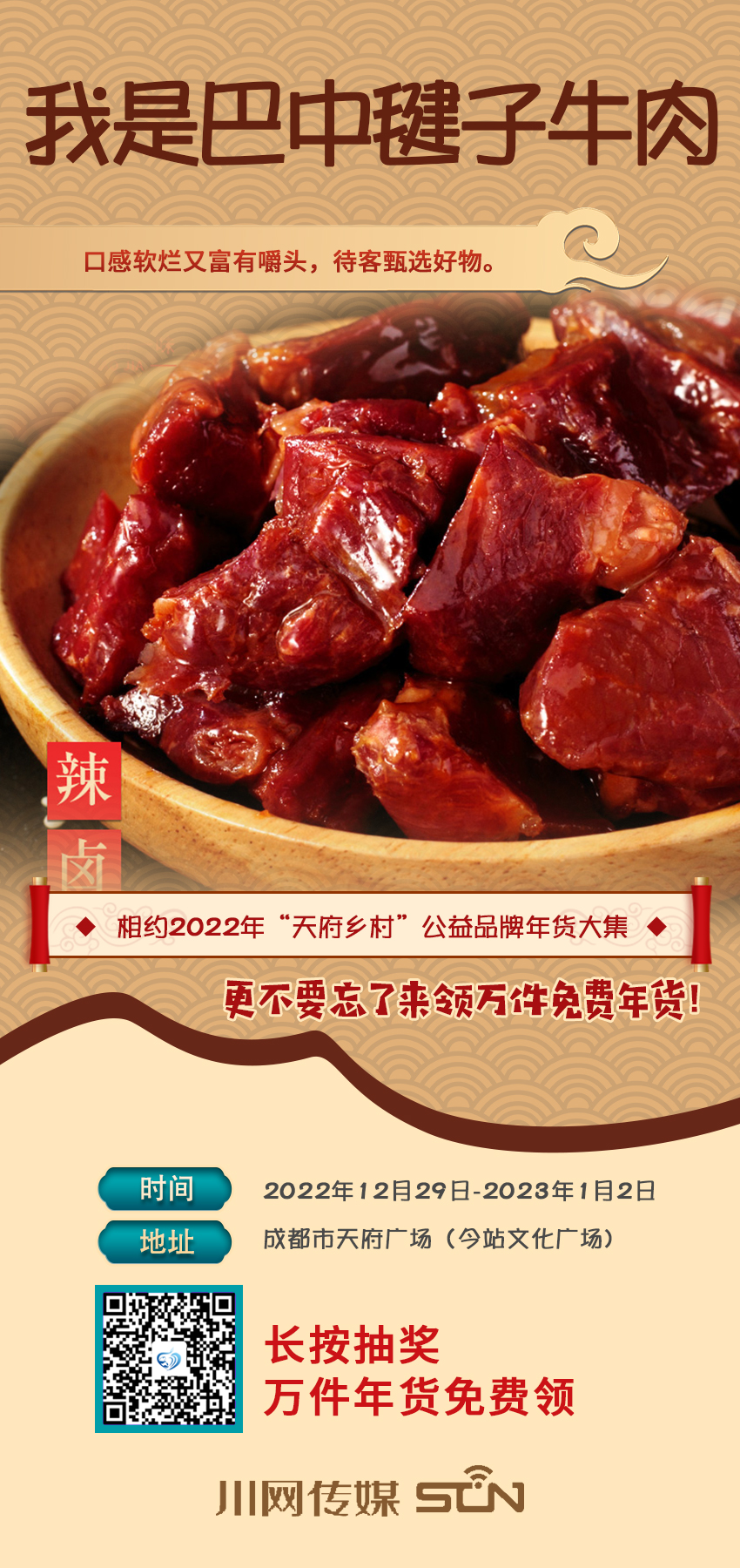 “累了困了,来领万件免费年货”,“天府乡村”公益品牌年货大集明天就开市了,还不准备起去天府广场(今站文化广场)买年货,抢相因。