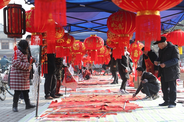 当天,正好孝泉赶大集,各种年货已经成为“主角”,对联、门神、灯笼、孔明灯等节日装饰品琳琅满目,集中的摊点在德孝城门口有序地一字排开,火红的颜色喜气洋洋。前来选购的市民三五成群,你挑我选中,俨然一幅购销两旺的热闹景象。
