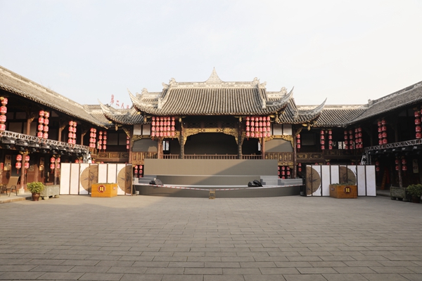 武圣宫内舞台已经搭好,静等迎春盛会开幕
