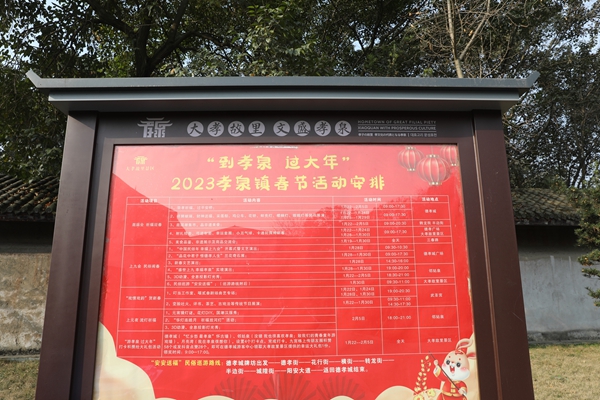 同时,武圣宫的舞台已经搭好,孝泉古镇的新年的传统盛会也即将启幕。礼拜孝子、财神送福、投壶射礼、过平安桥……逛庙会祈福迎春;龙狮表演、划采莲船、坐花轿……上九会民俗闹春;猜灯谜、旗袍秀、放河灯……上元夜流灯祈福,从1月22日到2月5日,从早到晚,孝泉古镇都有活动呈现,热闹不断,让大家在非遗中尽情感受中国的民俗年味儿。