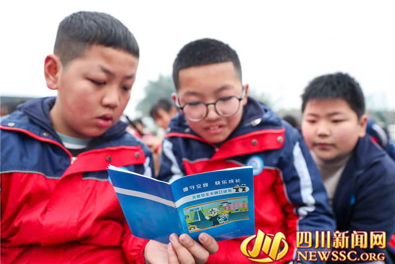 | 2月8日,四川省华蓥市铜堡初中春季刚开学行课的学生,在“讲法治, 讲安全, 护航健康成长”专题活动现场, 浏览法治宣传志愿者发放的交通安全知识卡通读物。 |