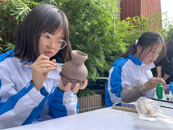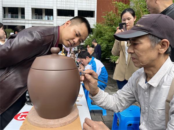 在比赛现场,参赛选手们在自己的参赛作品上分别配以彩绘、雕刻、书法等陶艺制作工艺,为作品赋予更多的精神内涵,更完美的展现陶器之美。“我是这个学期才开始学习陶艺的,对陶艺非常感兴趣。这次比赛我们学校包括我一共有5名学生和一名老师参加,我觉得是一次很好的经历,既锻炼了胆量,又能跟大家一起相互学习,对我来说是非常有意义的。未来,我也想从事陶艺事业,努力创作出优秀的陶艺作品,传承弘扬荣县的陶艺文化。”来自荣县职教中学的学生谢宇权说道。