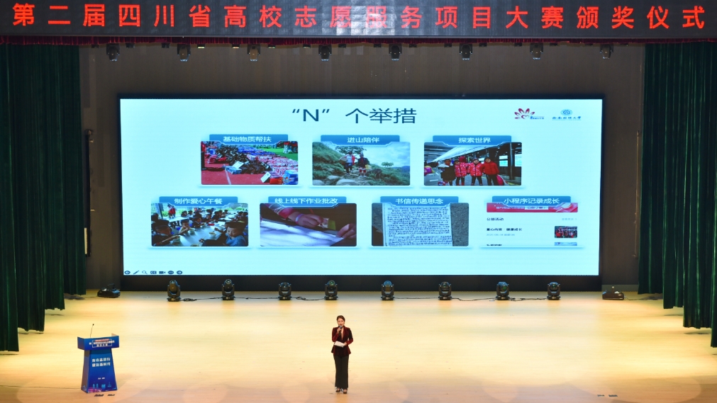 据悉,本次大赛由团省委联合省教育工委、省文明办、民政厅、省科协主办,共青团宜宾市委、宜宾学院承办。决赛当天,全省55所高校130个项目负责人逐一介绍项目的运行管理、实施成效和社会影响,最后从中评选出金奖20个,银奖40个,铜奖60个,优秀项目指导奖20个,优秀组织20个,特别贡献奖1个。“情系三农——偏远地区养殖户中医卓牧技能帮扶计划”“空中精灵”科技服务助力高原地区森林草原防灭火应急管理”“智行合一,青筑华章——服务青年健康及未来发展项目”等项目获得大赛金奖。
