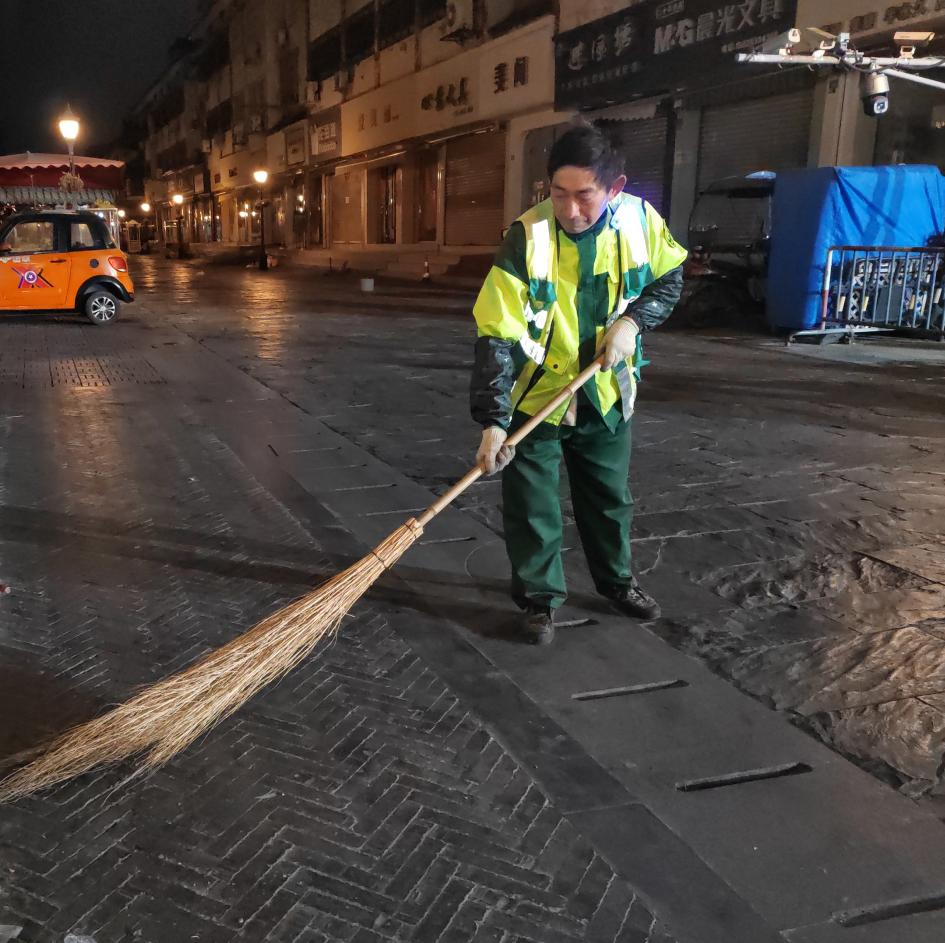 由于气温骤降,给环卫工作带来了更大的挑战。环卫工人们身穿厚重的棉衣,戴着帽子和手套,拿着扫帚、高压水枪冲洗道路,除去道路上的污渍和尘土,脚下每一条干净的街道都浓缩着他们对城市的爱。