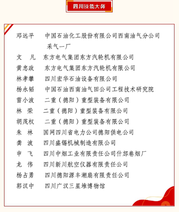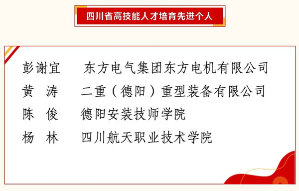 四川新闻网消息 为褒奖为全省经济社会高质量发展作出突出贡献的优秀高技能人才,以及涌现出的高技能人才培育先进集体和个人,日前,四川省人社厅等五部门发布《关于表彰四川省高技能人才工作先进集体和先进个人的决定》,德阳市4个单位获评四川省高技能人才培育先进集体、4人获评四川省高技能人才培育先进个人、14人获评四川技能大师、3人获评四川省技术能手,获奖数位居全省前列。