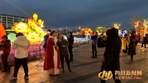 市民游客纷纷“打卡”灯会现场,与自己喜爱的花灯合照。