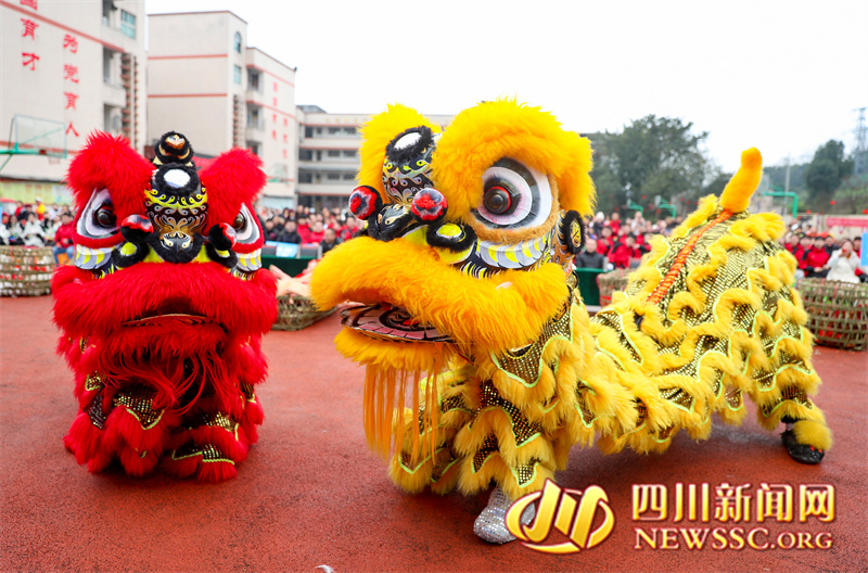 | 2月5日,民间艺人在四川省华蓥市古桥街道首届“乡贤杯”篮球联赛(村BA )闭幕式上表演舞狮。 |