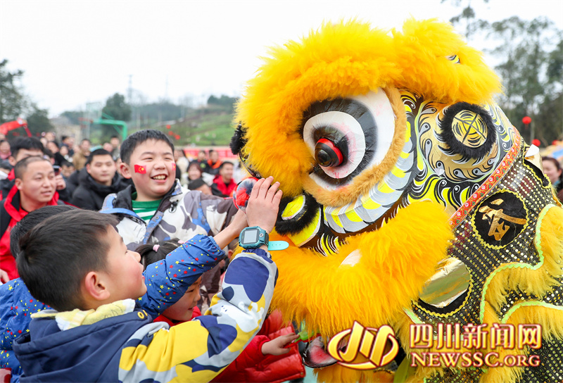 | 2月5日,在四川省华蓥市古桥街道首届“乡贤杯”篮球联赛(村BA )闭幕式上,小朋友在开心地抚摸民间艺人表演的狮头。 |