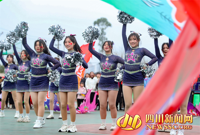 | 2月5日,在四川省华蓥市古桥街道首届“乡贤杯”篮球联赛(村BA )决赛现场,啦啦队在为参赛队员助威。 |