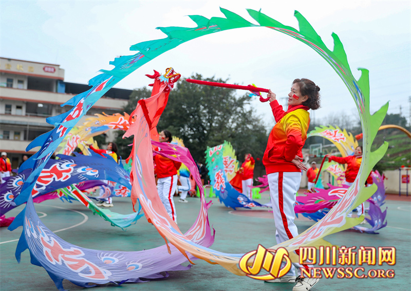 | 2月5日,在四川省华蓥市古桥街道首届“乡贤杯”篮球联赛(村BA )决赛现场,村民在舞布条龙。 |