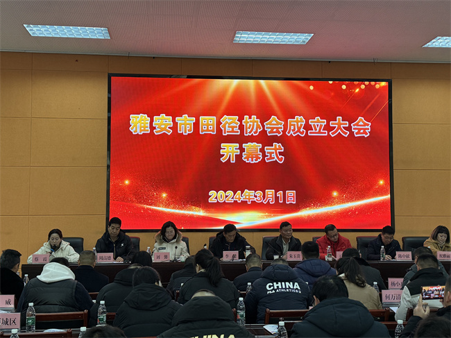 会议在响亮的国歌声中拉开序幕,会议共有两项议程:开幕式和雅安市田径协会第一次代表大会。按照《社会团体管理条例》规定,代表们听取并审议《雅安市田径协会章程》,表决《雅安市田径协会章程》,选举雅安市田径协会委员会代表名单,并由雅安市文化体育和旅游局领导陈中献宣读了《关于雅安市田径运动协会筹备成立登记的批复》;会议审议通过了《雅安市田径运动协会章程》,选举产生了第一届委员和主席团成员:祝雅丽当选为主席,蔡霞、赵晓龙当选为常务副主席,庹庆明、杨小兵、齐明继、彭贵明当选为副主席,杨红婴当选为秘书长。