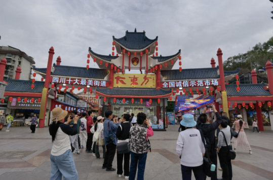 在最后一站东方广场,夜幕已逐渐降临,灯火辉煌的彩灯,将东方广场妆点得如梦如幻。几架无人机嗡嗡嗡地飞向半空,抓紧夕阳落幕前的蓝调时刻,拍下这个“四川十大最美街道”的魅力之姿。