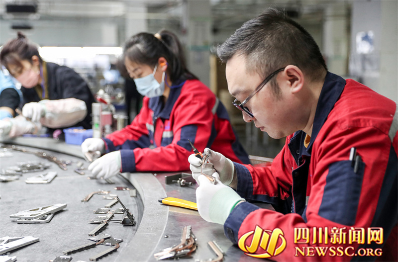 | 4月7日,在四川省华蓥山经开区电子信息产业园,四川品岱电子科技有限公司的工人在生产流水线上加工“订单”产品笔记本配件散热模组。 |