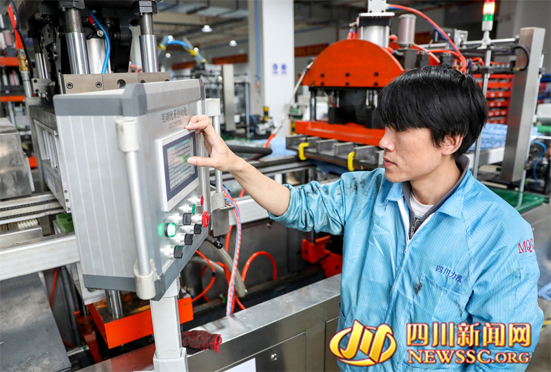 | 4月7日,在四川省在华蓥山经开区电子信息产业园,四川力泓电子科技有限公司的工人在生产“订单”产品笔记本配件散热模组模具盒。 |