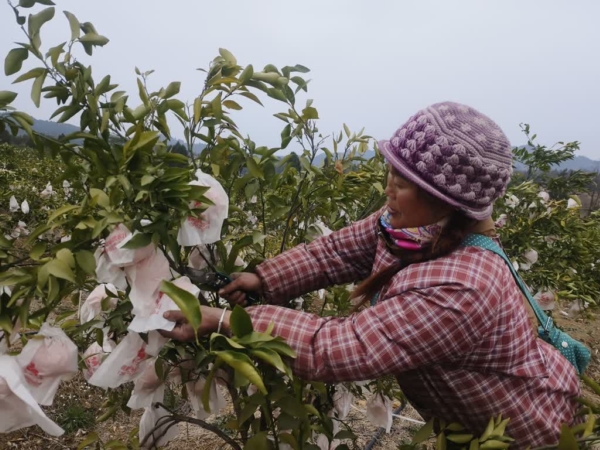 走进金龙村的耙耙柑基地里,一个个金黄色、果实饱满的耙耙柑挂满枝头。果树下,村民小心地将成熟的耙耙柑剪下,熟练地装入筐中。另一边的村民则将黄澄澄的耙耙柑进行分拣、装筐,通过货运三轮车运往道路旁进行集中转运。