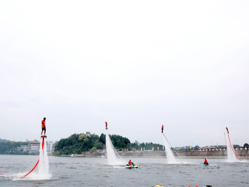 风和日丽,鲁班湖碧波荡漾,一派水乡泽国的美丽景象。水上飞人表演者个个身怀绝技,他们踩着水柱,时而如蛟龙出海一飞冲天,时而前后空翻、360度空中回旋。精彩纷呈的表演,让现场的观众大饱眼福。