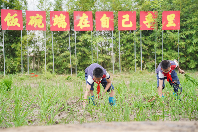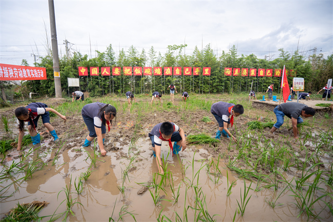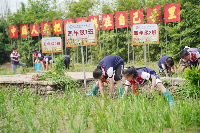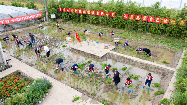 “秧苗的选择呢,我们一般选择健壮的,无病无虫,绿色嫩绿的秧苗,然后高度在二十到二十五厘米……”在该校“智慧田园”主粮种植区,老师们为同学们深入浅出地传授稻谷生长的要领,并演示插秧的方法。随后,同学们纷纷挽起裤腿,踏入泥泞的水田,亲身投入到稻谷的种植中。他们小手起落间,嫩绿的秧苗插满福田。虽然泥水溅满了全身,但同学们的脸上洋溢着满足和喜悦,齐心协力播撒希望的种子。