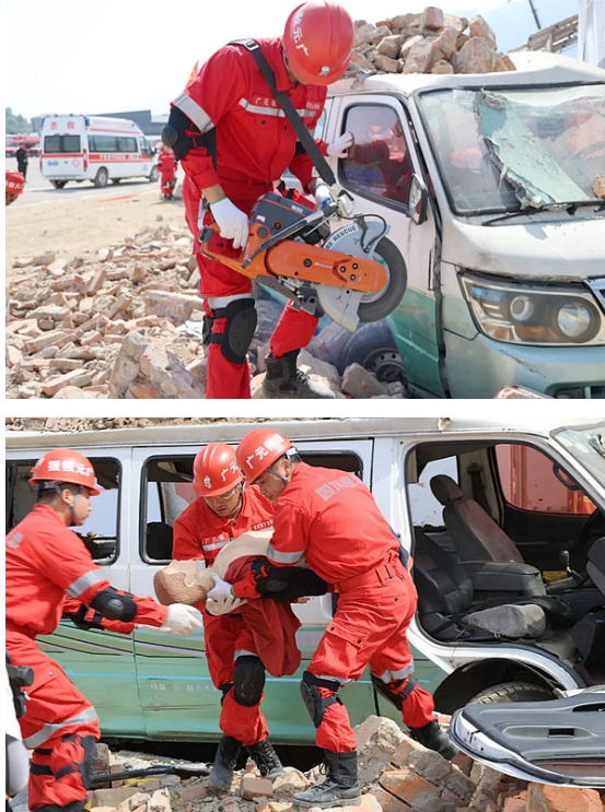 队伍进入搜救区域后,现场指挥员将人员分为警戒组、生命搜寻组、侦察组、支护组、救护组,各组人员按照任务分工迅速展开工作。侦察组发现一名遇险人员压在小型客车驾驶室,立即对现场进行标识,由于埋压过深无法直接救援,指挥人员决定采取先破拆,再救援的方案进行,并利用破拆装备,顺利打开车门,将1名遇险人员用担架搬运至医疗救助点。5分钟后,在废墟内发现另1名埋压人员,支护组人员快速支护,打通生命通道,将遇险人员成功救出。