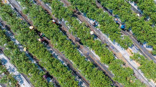 走进蓝莓基地,一排排蓝莓树整齐排列,绿叶掩映间,一簇簇粒大饱满的蓝莓喜上“莓”梢,浓郁果香扑鼻而来。此刻,50余名工人正忙碌地穿梭在蓝莓树间,他们身背果篓,头戴遮阳帽,手法熟练地采摘着成熟的蓝莓。每一颗蓝莓都经过他们的精心挑选,确保果实的新鲜与品质。果园内,欢声笑语不断,丰收的喜悦溢于言表。