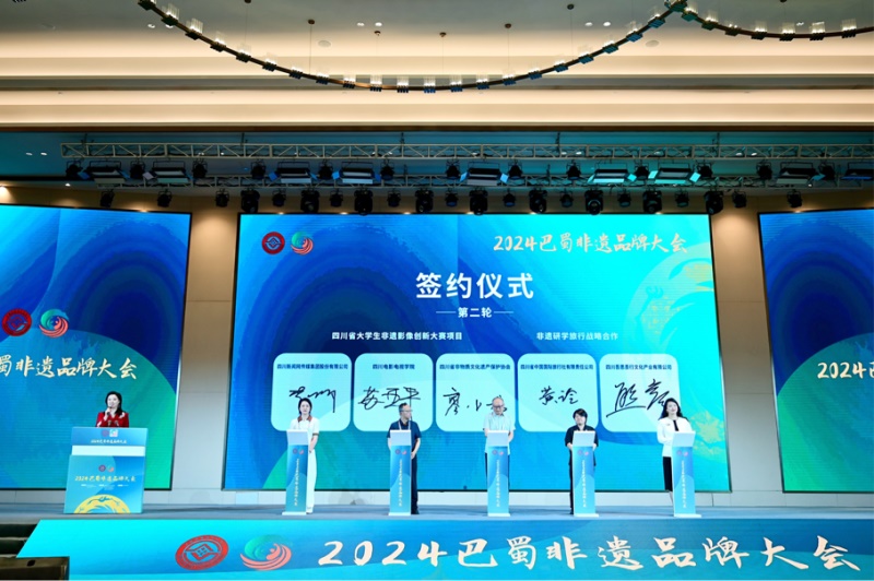 启动仪式上,相关部门向首批30个四川省优秀非遗工坊授牌。大会公布了“2023——2025年国家级非物质文化遗产生产性保护示范基地”川渝两地8家企业名单,发布了“川工蜀艺”四川非遗公共品牌、巴蜀非遗品牌机会清单,10余家单位和机构现场签约。中国人民大学创意产业技术研究院、潮玩品牌泡泡玛特国际集团负责人围绕非遗创意产品设计和市场转化作了主题分享。