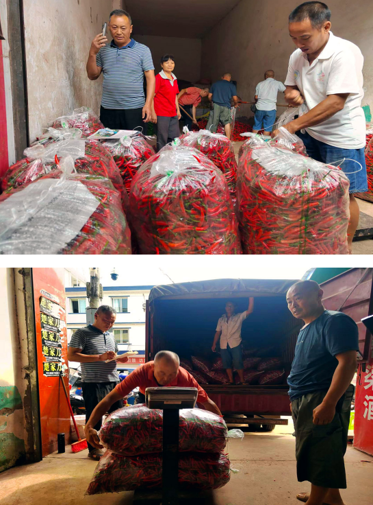 6月17日上午,在镇上的一家海椒收购点里,村民们正在忙着把刚收上来的大量海椒打包装袋,运往外地市场。