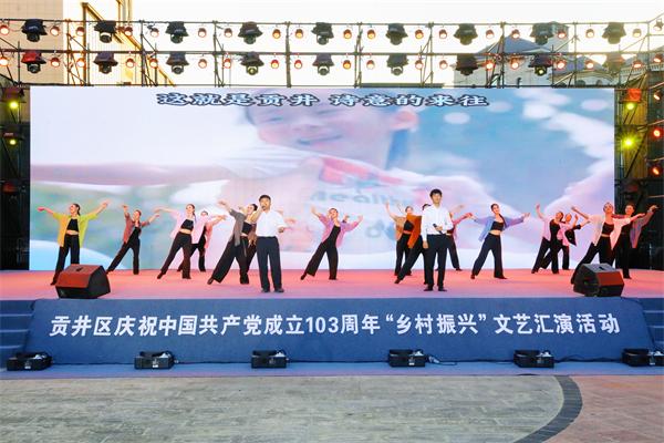 四川新闻网消息(孔云 李惠玲 刘庆 罗雨果 崔青) 7月1日,由贡井区委、贡井区人民政府主办,区委组织部、区委宣传部、区文化广播电视和旅游局、区农业农村局承办的“初心不忘永向党 凝心聚力谱新篇”——贡井区庆祝七一“乡村振兴”文艺汇演活动在卓逸新天地广场举行。