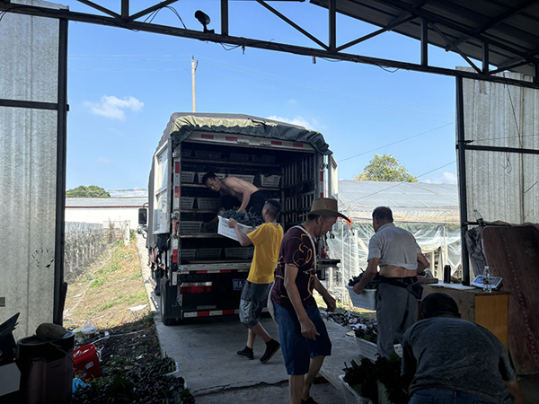 在紫岩街道蔚泉社区种植大户刘刚的葡萄园里,串串葡萄从叶缝中垂下来,令人垂涎欲滴。工人们在葡萄藤架下忙着拆袋、采摘、打包。不远处的大路旁停靠着一辆大货车,正准备将装好的葡萄运送到省内外市场。
