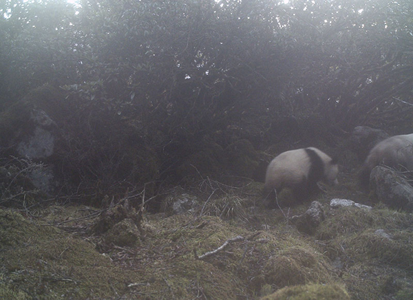 2020年5月,在广济镇三江村大山深处,峰峦叠嶂,郁郁葱葱,两只可爱的野生大熊猫出现在红外相机的镜头里。其中一只露出了肥硕的屁股,在连片的竹林中悠然散步,另一只则紧随其后,步伐稳健,憨态可掬的模样惹人怜爱。这是绵竹片区首次拍摄到野生大熊猫“母子同框”的活动影像。