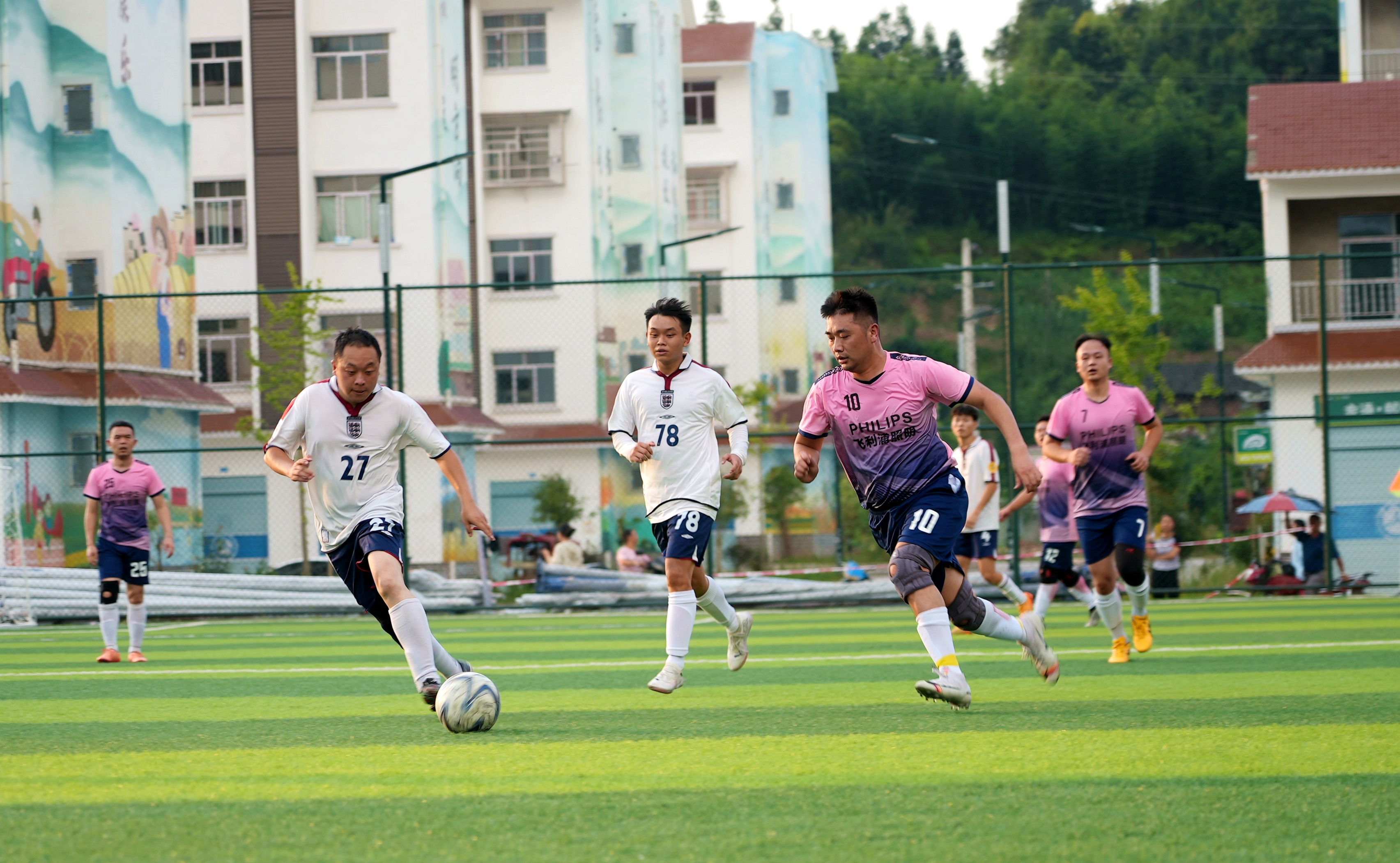 比赛现场,随着主裁判的一声哨响,足球腾空而起,球员们奋力拼抢、展开激烈角逐。带球过人、精准妙传、劲射入网……球场上精彩场面应接不暇,场外观众欢呼声、助威声不绝于耳,浓厚的比赛氛围彰显出乡村赛事的独特魅力。