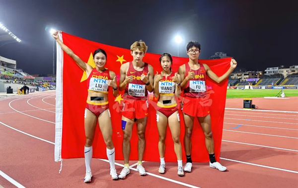 男女混合4×400米接力决赛——付浩然、王雅伦、艾力西尔·吾买尔、刘英兰组成的中国队以3:21.27的全国青年新纪录成绩,夺取一枚宝贵铜牌!冠军是澳大利亚队,成绩是3:19.27,新的大洋洲青年新纪录。