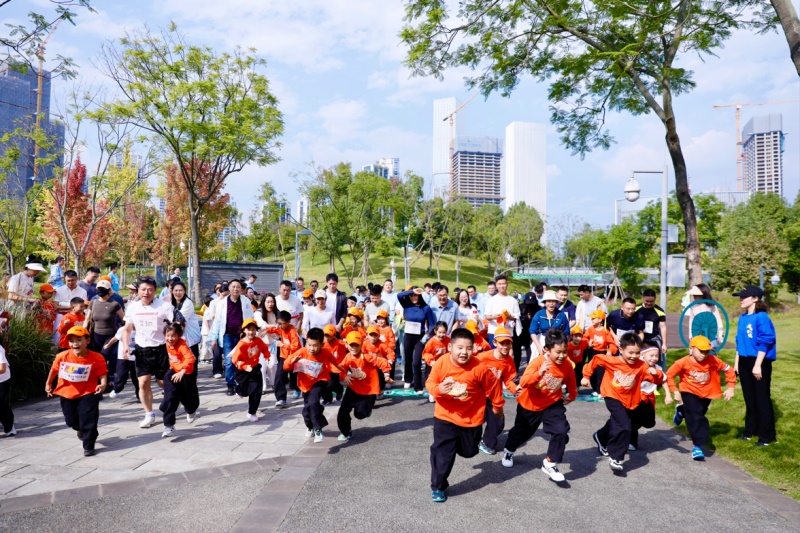 当日下午,随着一声指令,2.8公里的亲子迷你马拉松正式开跑。小学生们和爸爸妈妈一起,大手牵小手,倾尽全力,从天府七中出发,途经嘉州路、天府公园等标志性地标和人文景点,感受天府新区的秋日胜景,在运动中沉浸式体验公园城市十年变迁,用脚步丈量这座城市的美丽。看着选手们奔跑时矫健的步伐,现场观众不停地挥手,沿途的呐喊声、加油声此起彼伏。