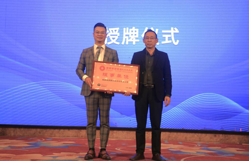 成都旅游协会执行会长胡万银向智游飘数字文旅创始人梁珑涛授予荣誉牌匾