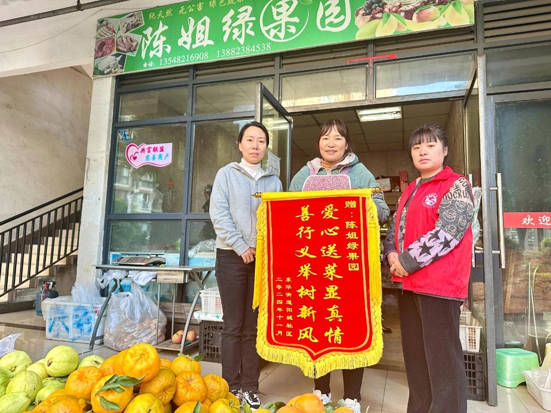 记者采访了解到,陈寿珍卖菜多年,只要遇到经济困难的群众,都会免费为他们送一点菜。通过社区免费送菜,她已经坚持了1年多。11月26日,攀枝花市东华街道阳城社区党委书记黄小华和同事,拿着一面绣有“爱心送菜显真情,善行义举树新风”的锦旗送给了陈寿珍:“我们代表社区居民向你表示感谢!”